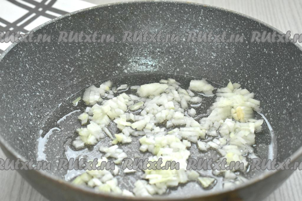 Пока варится картофель, займёмся обжариванием шампиньонов. Для этого прежде всего очищаем морковь и лук. Разогреваем растительное масло на сковороде, выкладываем мелко нарезанный лук и обжариваем его 3 минуты на среднем огне, периодически помешивая.