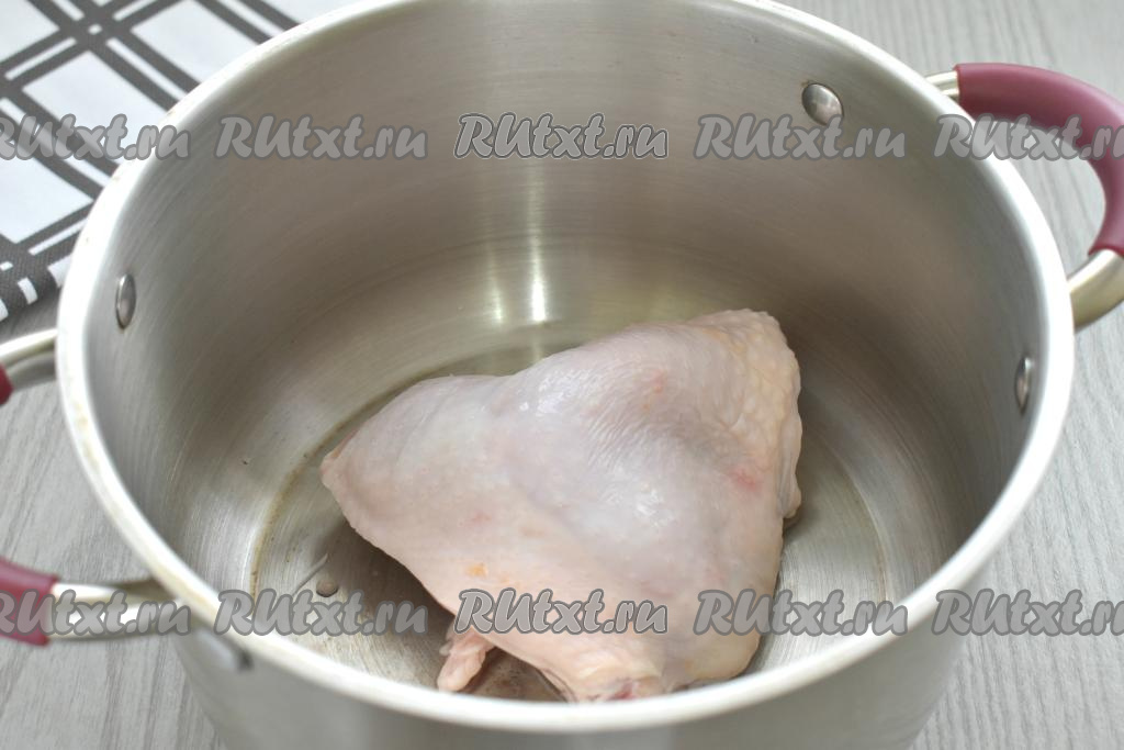 Части курицы (я взяла куриное бедро) моем, перекладываем в кастрюлю и заливаем 2,5 литрами холодной воды, ставим на огонь. После того как вода закипит, убираем с поверхности пену и варим куриное мясо до готовности (минут 35-40) на небольшом огне.
