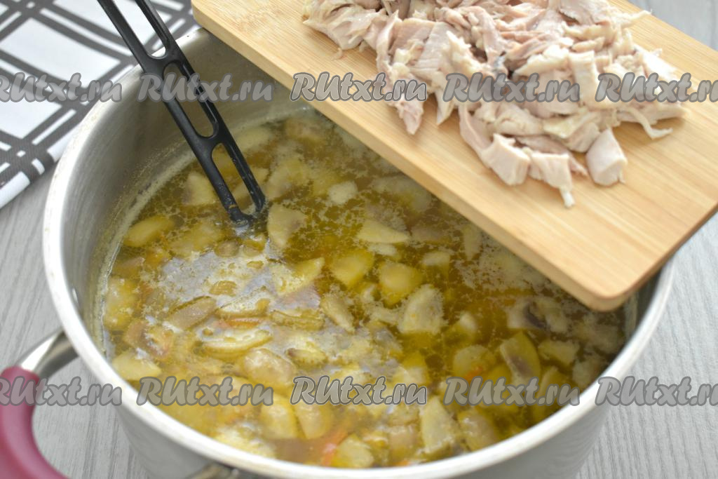 После того как картошка проварится в гороховом супе 15 минут (картофель должен стать достаточно мягким), в кастрюлю выкладываем со сковороды шампиньоны с морковкой и луком. Сразу же добавляем куриное мясо, отделённое от костей и нарезанное на кусочки. Солим гороховый суп с грибами и курицей, даём закипеть и варим на небольшом огне 5-7 минут.