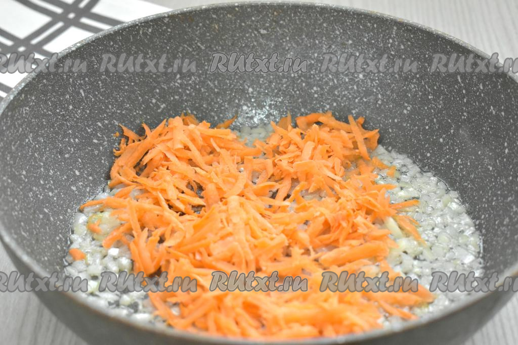 В сковороду с обжаренным луком выкладываем натёртую на крупной тёрке морковь, сразу перемешиваем, обжариваем овощи вместе 5 минут (до мягкости морковки), иногда помешивая.