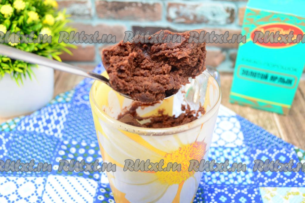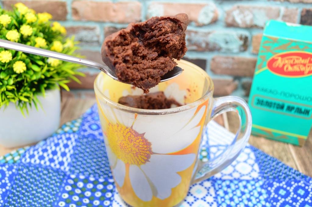 Дать выпечке слегка остыть и тёплой подать к столу. А вот как кекс с какао, испечённый в кружке в микроволновке, выглядит на ложке. Он очень вкусный, мега шоколадный и в меру сладкий, а на замешивание теста и выпечку в общей сложности вам понадобится 5 минут.