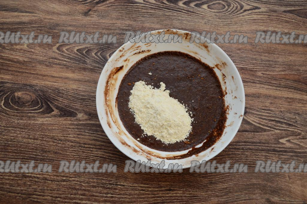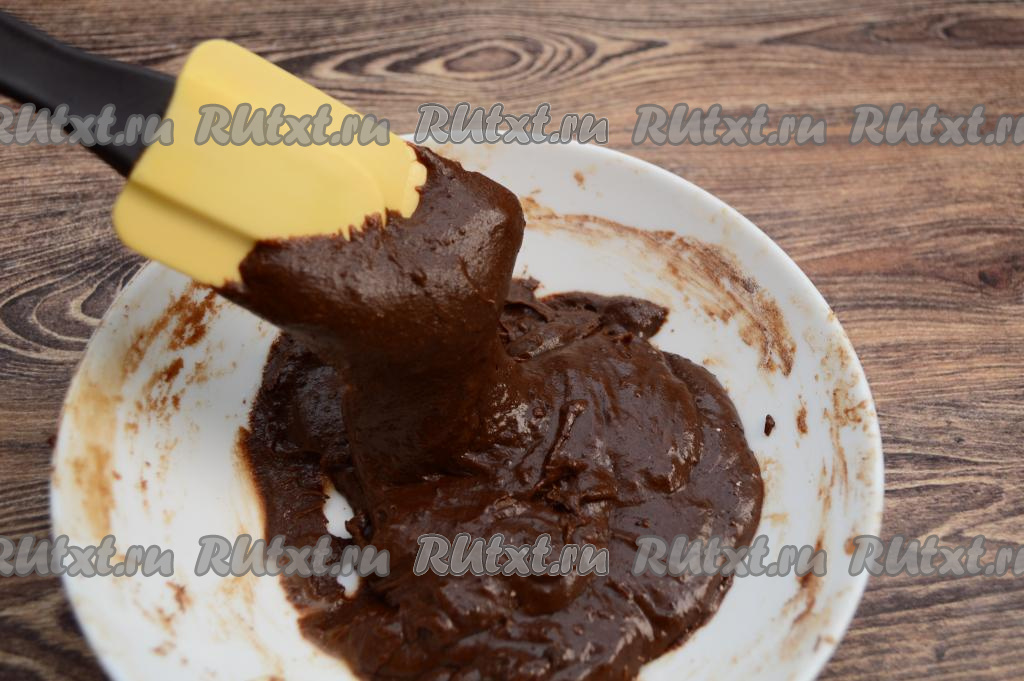 А затем, добавляя по половине столовой ложки муки и каждый раз хорошо вмешивая её, замесить шоколадное тесто, напоминающее очень густую сметану, оно будет медленно стекать с лопатки. Добавляя муку, обязательно учитывайте густоту теста, а не количество муки, указанное в ингредиентах.