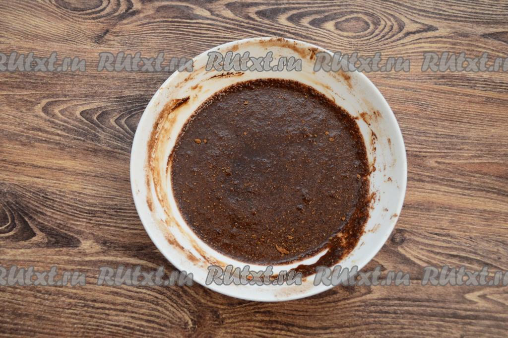 Тщательно перемешать вилкой (или венчиком) масло с сахаром, стараясь, чтобы сахар хорошо растворился. Молоко тоже немного подогреть в микроволновке. В масло, смешанное с сахаром, влить тёплое молоко, тщательно перемешать. В получившуюся смесь просеять какао.