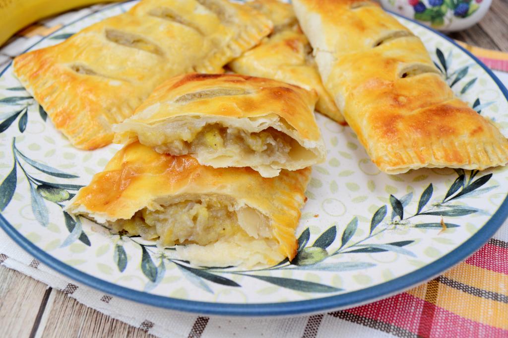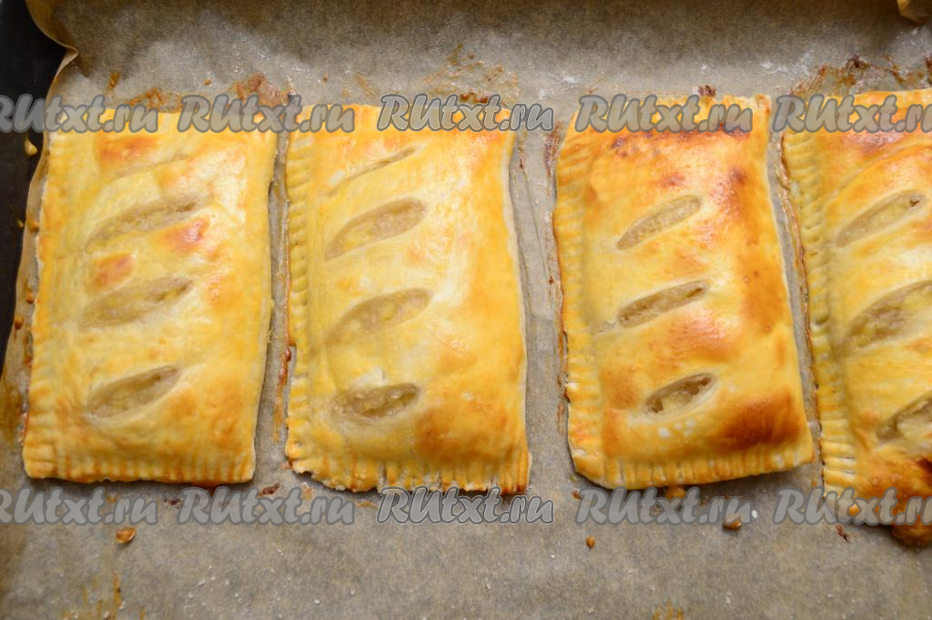 Готовые слойки с банановой начинкой достать из духовки, немного остудить и можно угощаться. Кстати, такая выпечка вкусна и в остывшем виде.