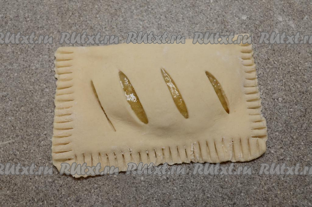 Вилкой скрепить края слойки. Если вилка в процессе скрепления краёв слойки будет прилипать к тесту, можно окунать кончики вилки в муку. Сформированную слойку сразу переложить на застеленный пергаментом противень.
