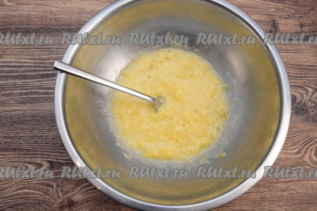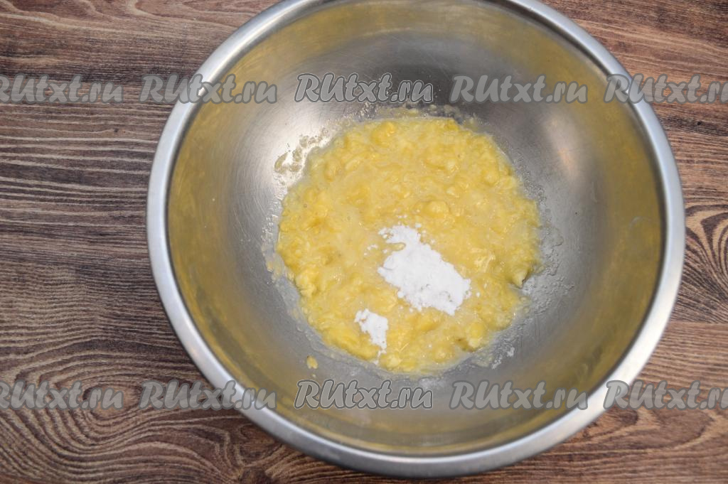 Смешать вилкой банан и сахар до получения однородной банановой массы. Всыпать крахмал.