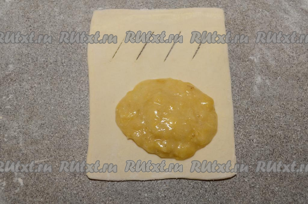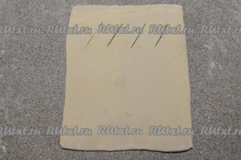 Вначале один квадрат из слоёного теста на присыпанной мукой поверхности раскатать скалкой в прямоугольник со сторонами примерно 12 сантиметров на 16 сантиметров и толщиной около 2 миллиметров. Сделать ближе к одной из узких сторон прямоугольника 4 надреза ножом, отступая от краёв по 1-1,5 сантиметра.