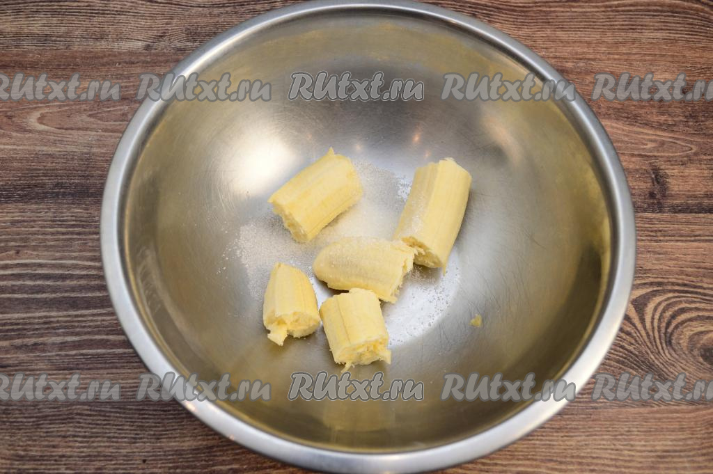В миску всыпать сахар, добавить очищенный и разломанный на кусочки банан.