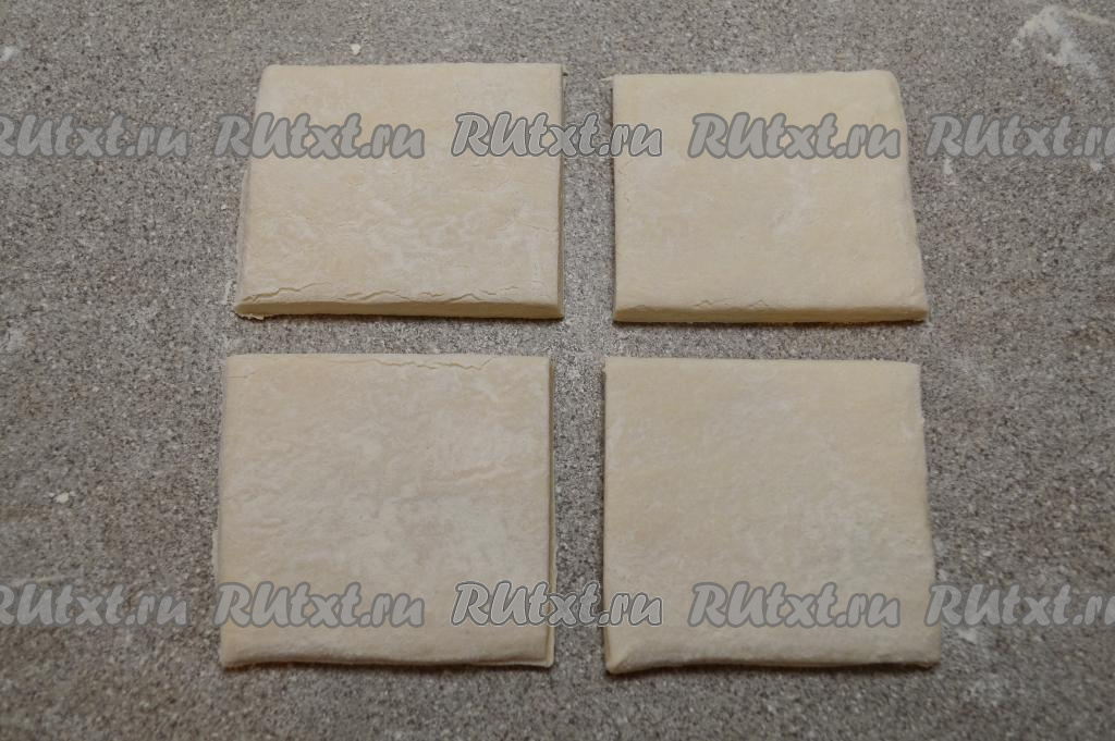 Слоёное тесто заранее разморозить при комнатной температуре (размороженное тесто станет более мягким и податливым). Разрезать пласт теста на 4 квадрата.