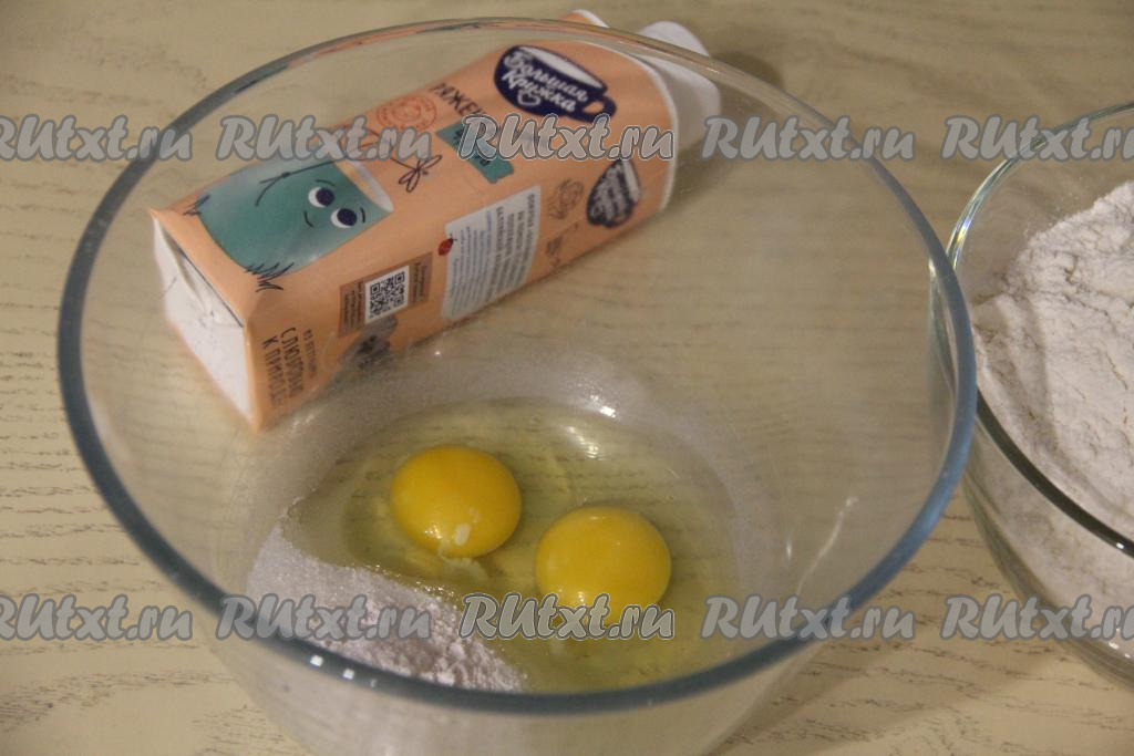 В миску для замешивания теста вбить яйца, добавить сахар и ванильный сахар.