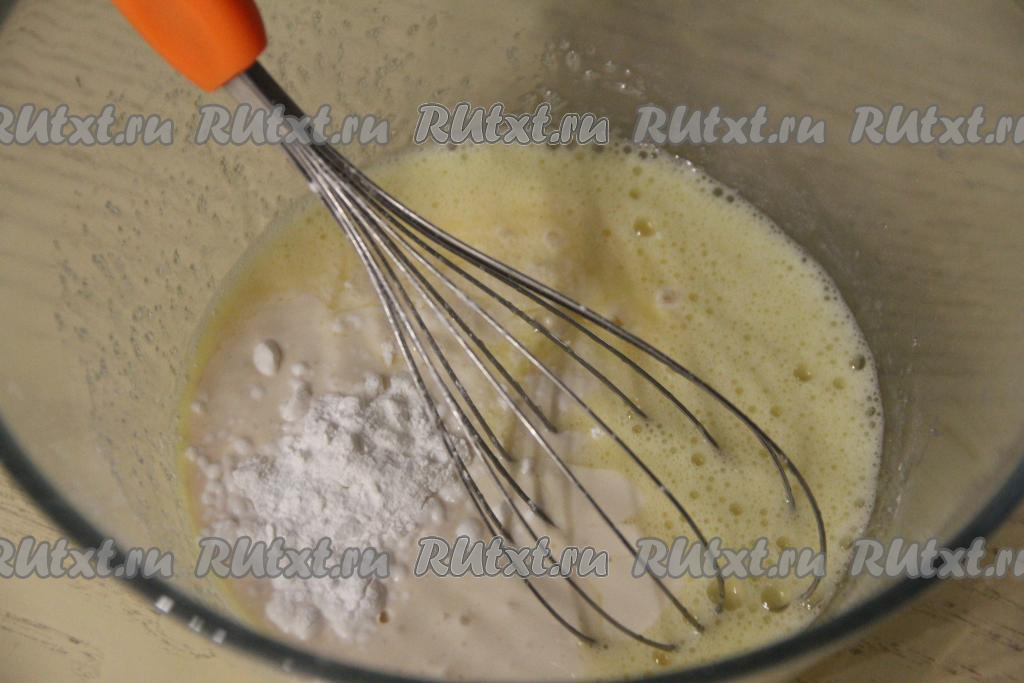 Перемешать яичную смесь венчиком в течение 2-3 минут, она должна посветлеть, стать однородной. Затем влить ряженку, перемешать, всыпать разрыхлитель, снова перемешать и оставить на 5 минут.