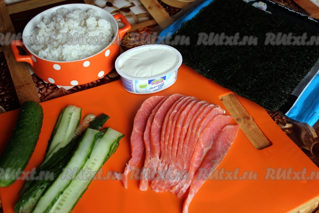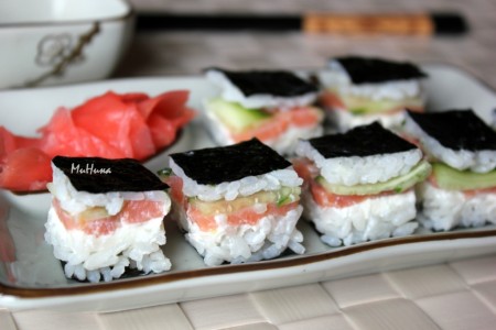 Скручивать роллы и делать суши несложно, но для разнообразия предлагаю способ приготовления закусочного суши торта. Такой быстрый закусочный торт можно приготовить из любых традиционных для суши продуктов, т.е. обязательно нори и рис, а далее простор для фантазии: форель слабосолёная или другая рыба по вкусу, огурец или авокадо и т.д.