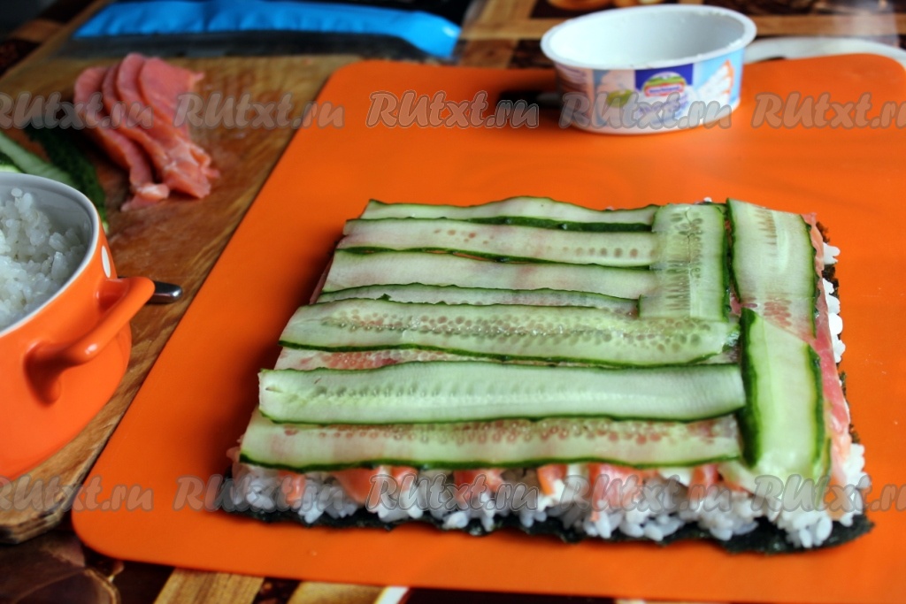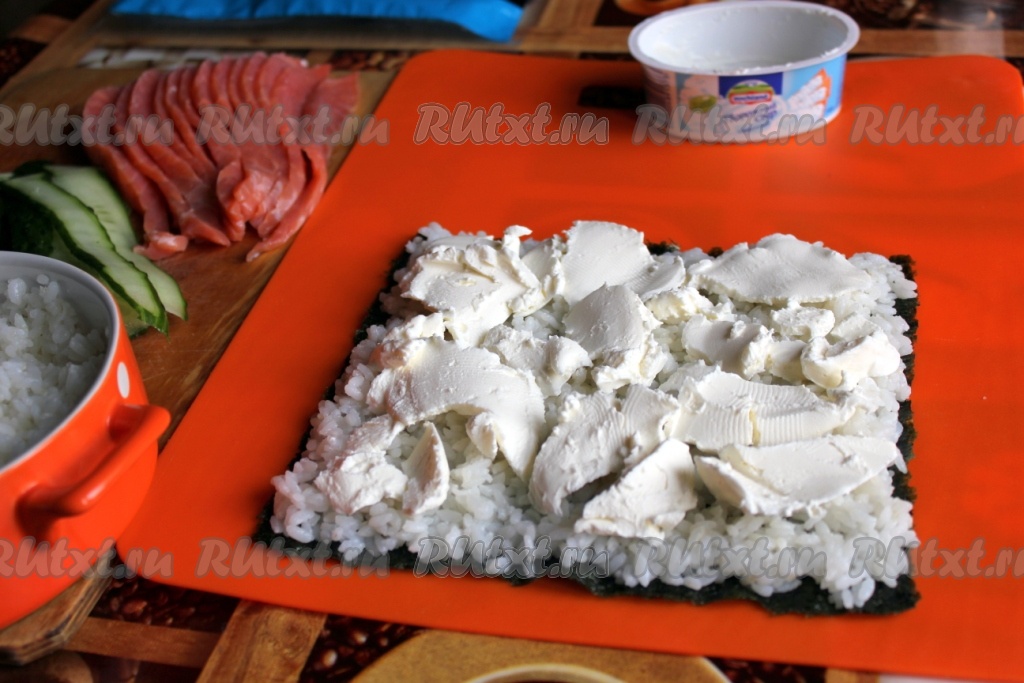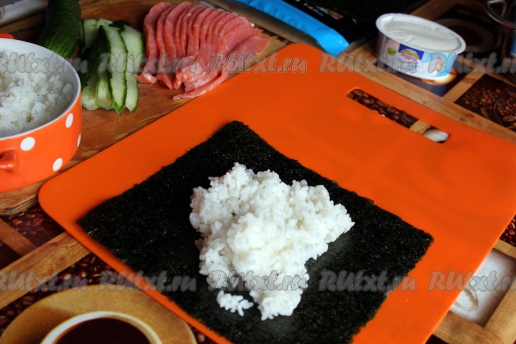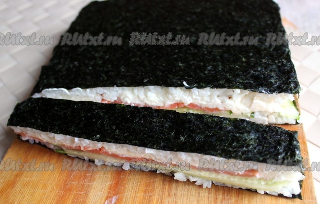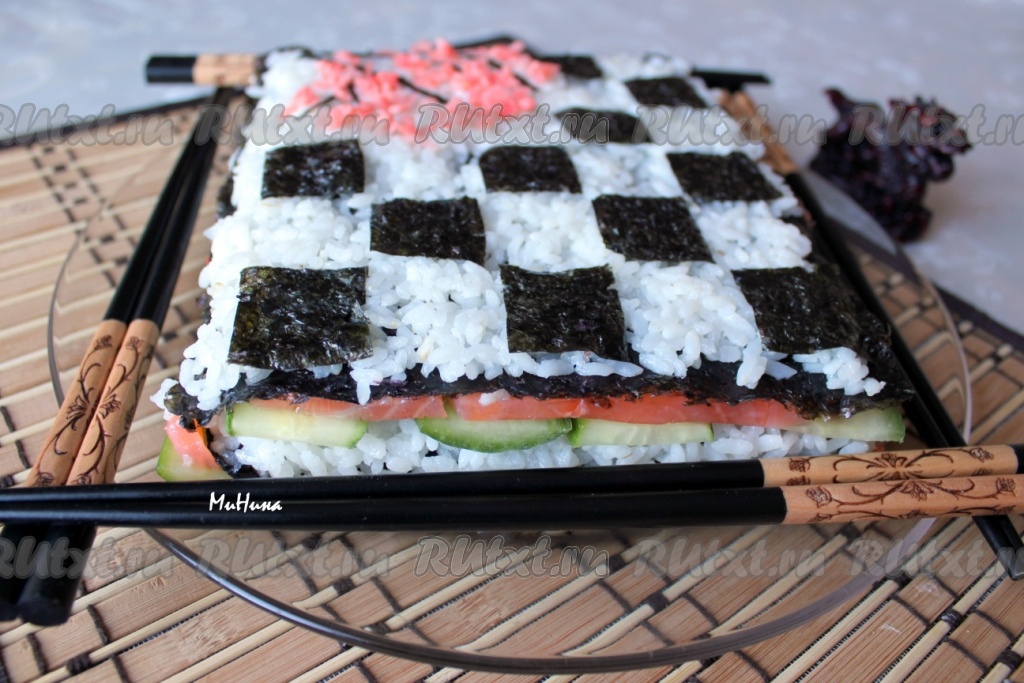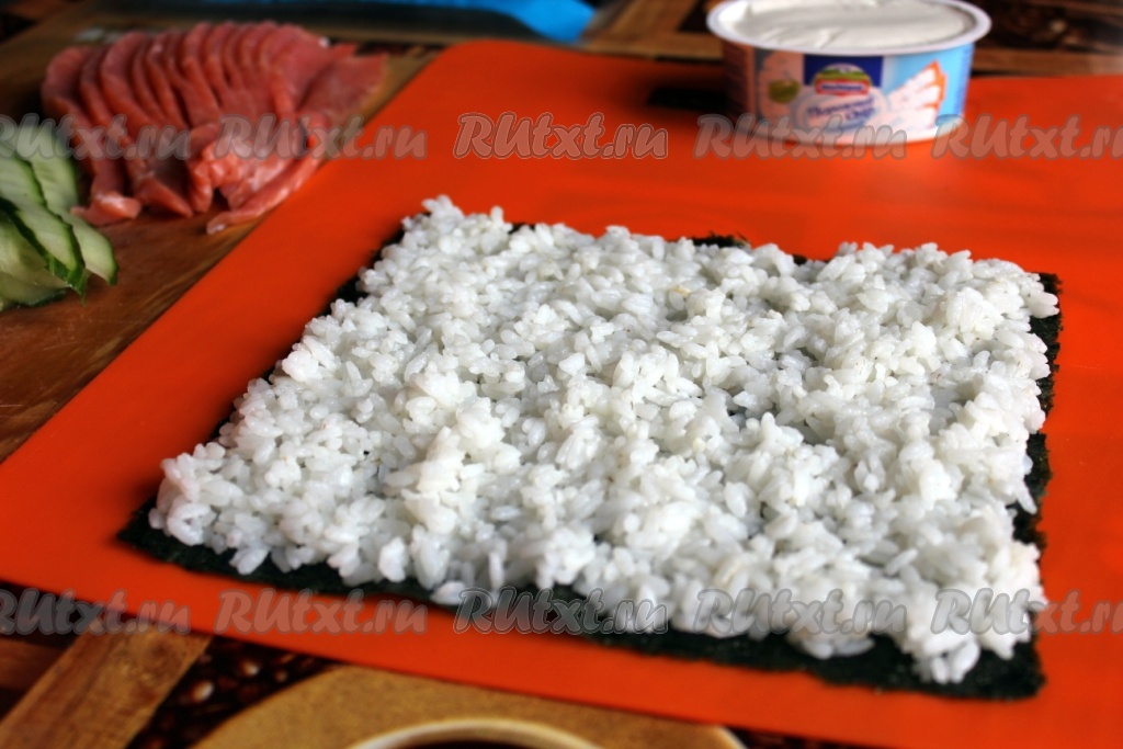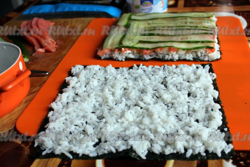 Далее возможны варианты по желанию: положить нори рисом наверх или рисом внутрь или повторить все слои ещё раз и даже украсить.