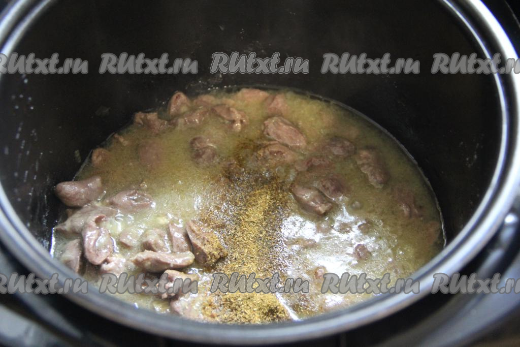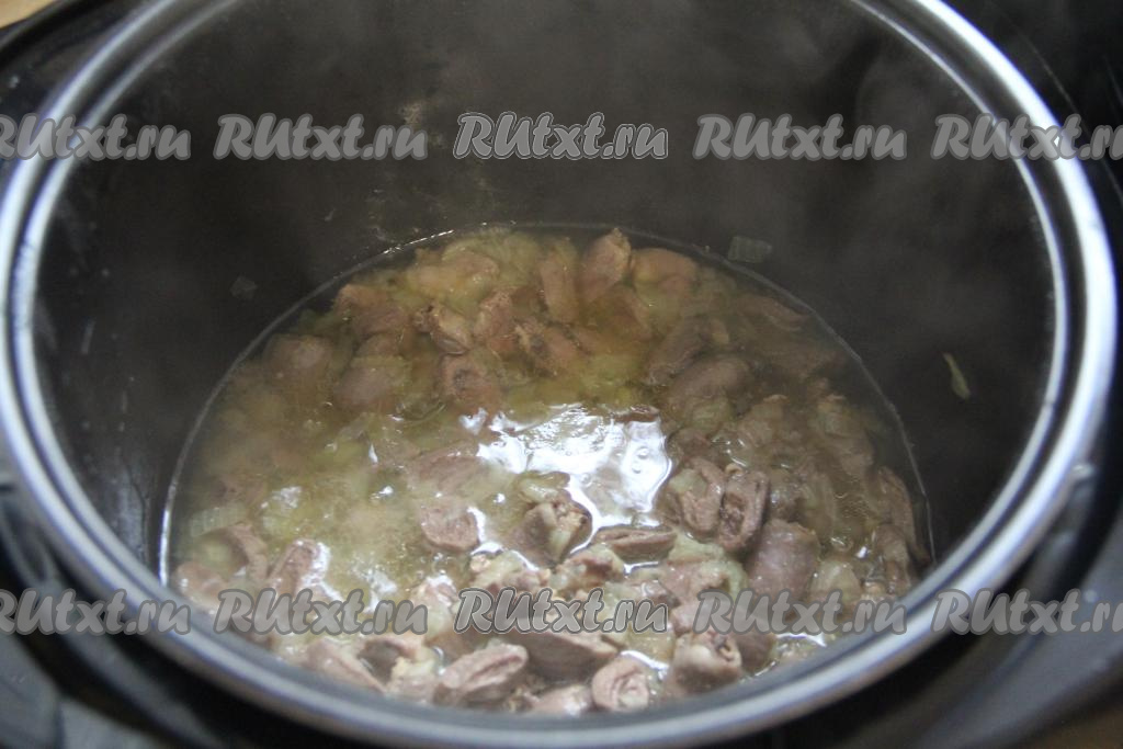 Обжаривать сердечки с луком минут 7, не закрывая крышку мультиварки, иногда помешивая. Затем закрыть крышку мультиварки и выставить режим "Тушение" на 30 минут. Томиться сердечки будут в собственном соку, из них выделится достаточное количество жидкости.