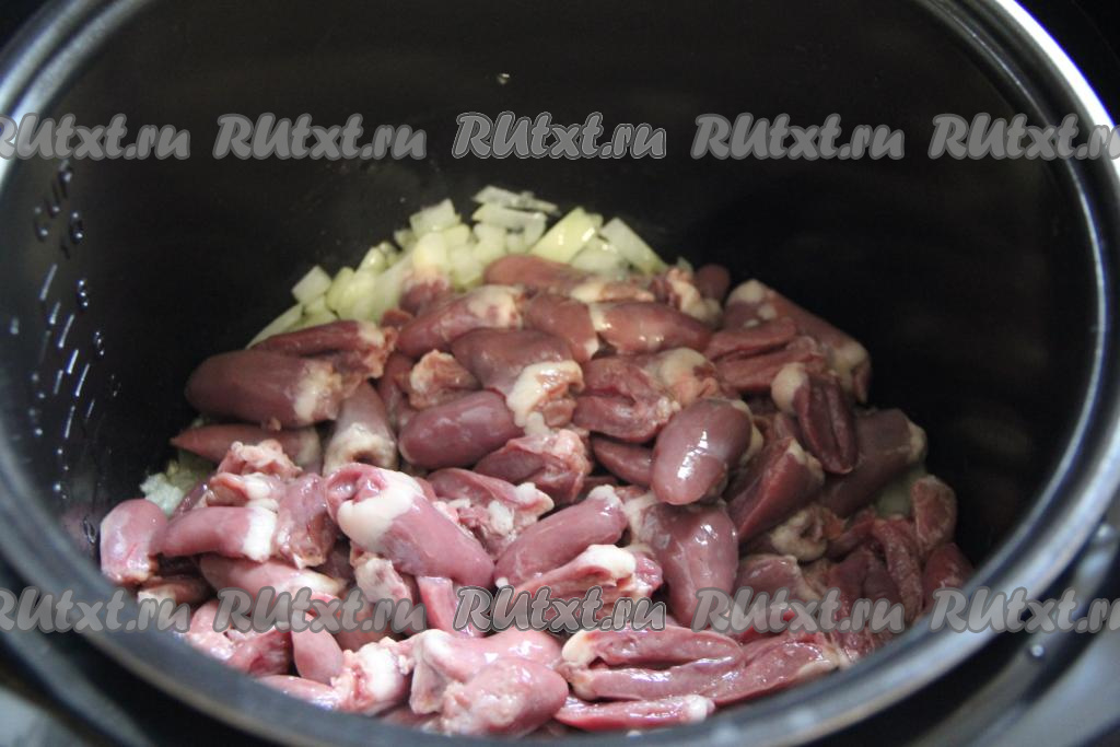 Сердечки разрезать на две части, удалить крупные сосуды, Разрезанные сердечки хорошо промыть под проточной водой, удаляя сгустки крови. Подготовленные сердечки выложить в чашу мультиварки с обжаренным луком, перемешать.