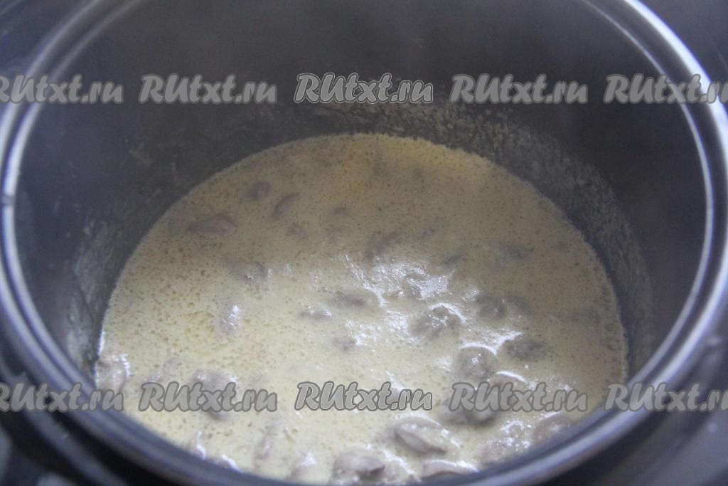 Добавить сметану, перемешать куриные сердечки, закрыть крышку мультиварки. Установить режим "Тушение" на 10 минут.