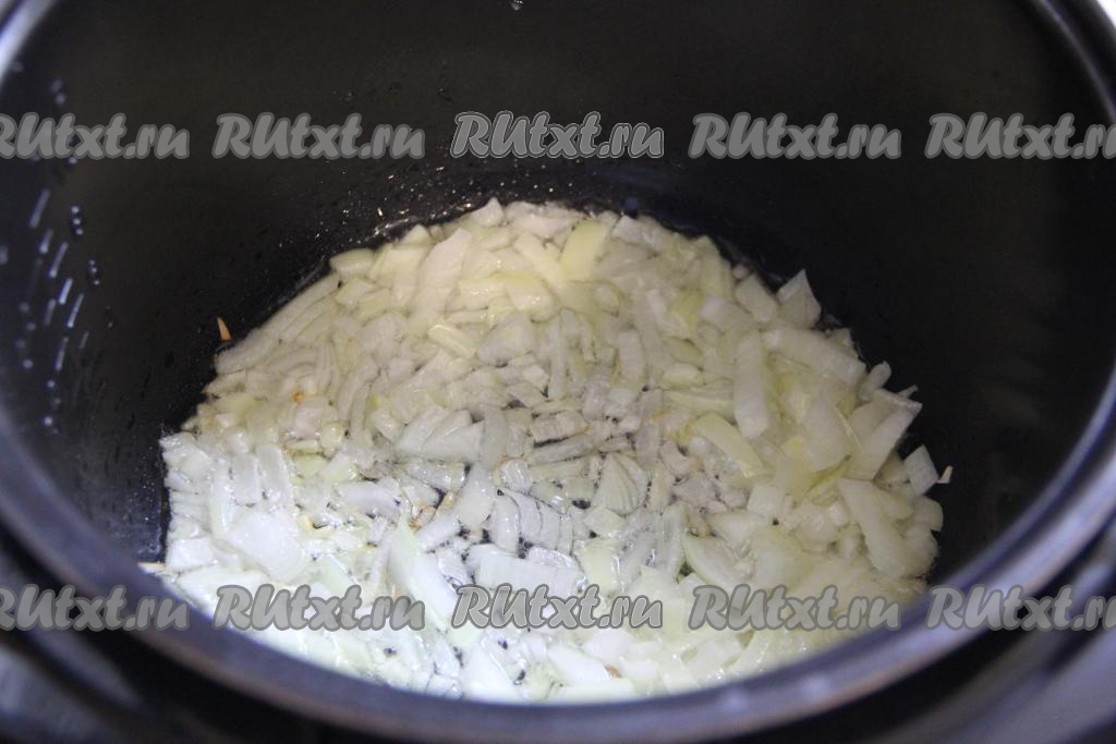 В чашу мультиварки влить растительное масло, выставить режим "Жарка" на 15 минут. Лук почистить, мелко нарезать, выложить в чашу мультиварки, обжаривать его минут 5-7, иногда перемешивая.