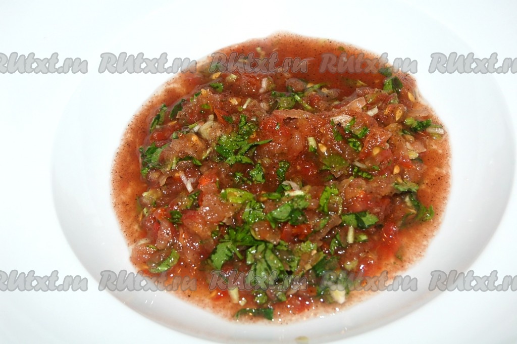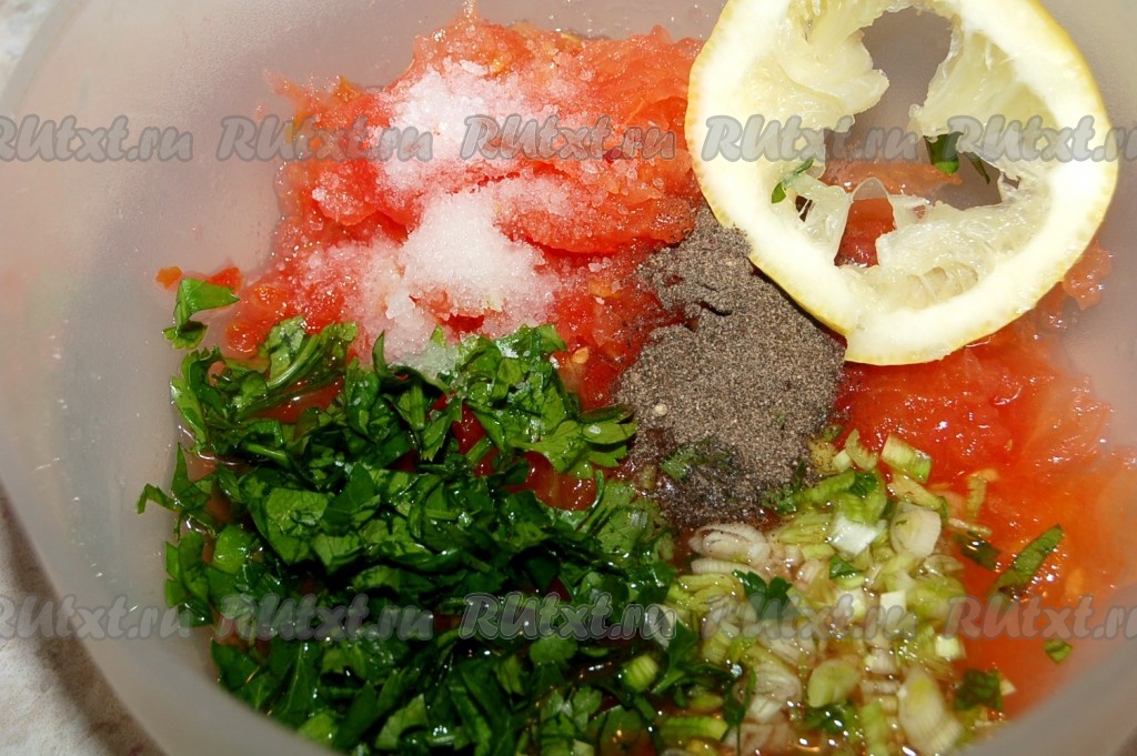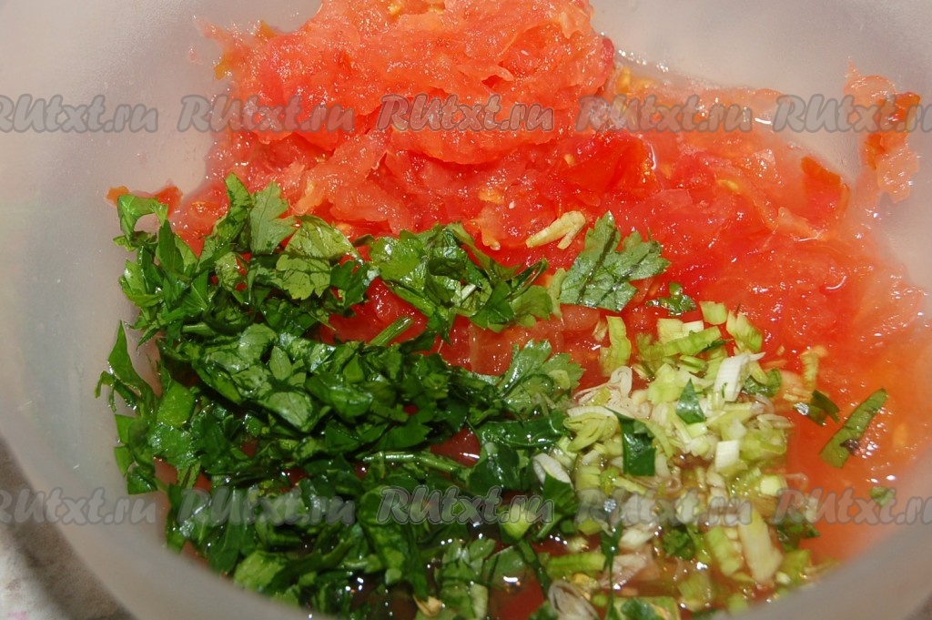 В миску натереть на терке свежий помидор, добавить измельченные петрушку, чеснок.