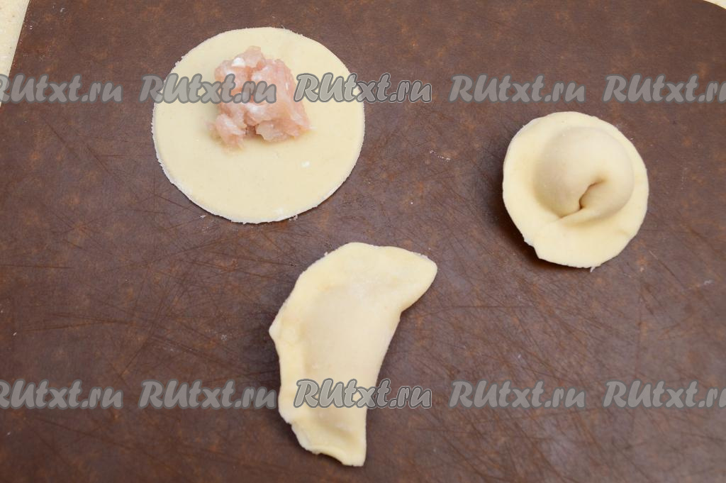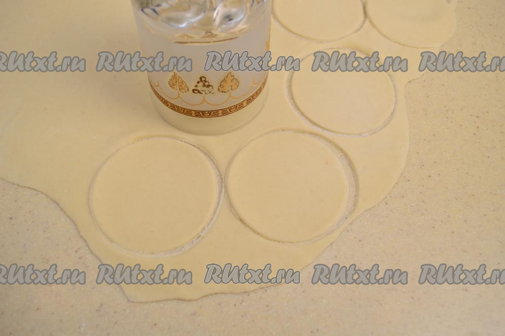 Отдохнувшее тесто, замешанное на кипятке без добавления яиц, разделить на 4 части. Одну часть теста на слегка присыпанном мукой столе раскатать в очень тонкий пласт. Тесто очень эластичное, хорошо раскатывается, не рвётся, поэтому стол практически не требуется припылять мукой. Затем чашкой или стаканом вырезать из теста круглые заготовки пельменей.