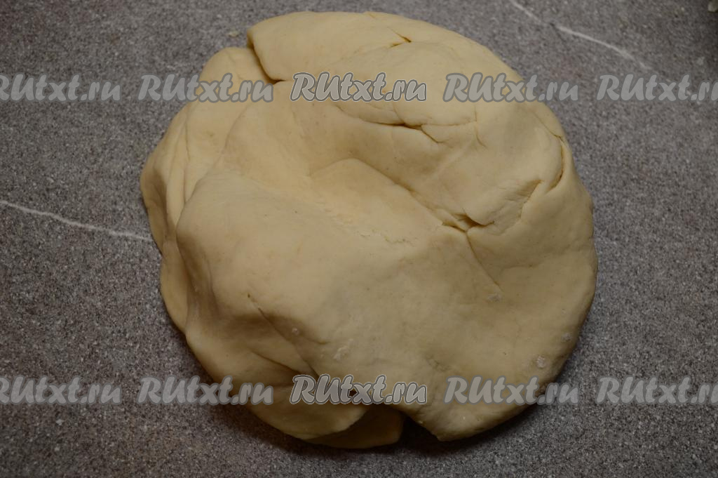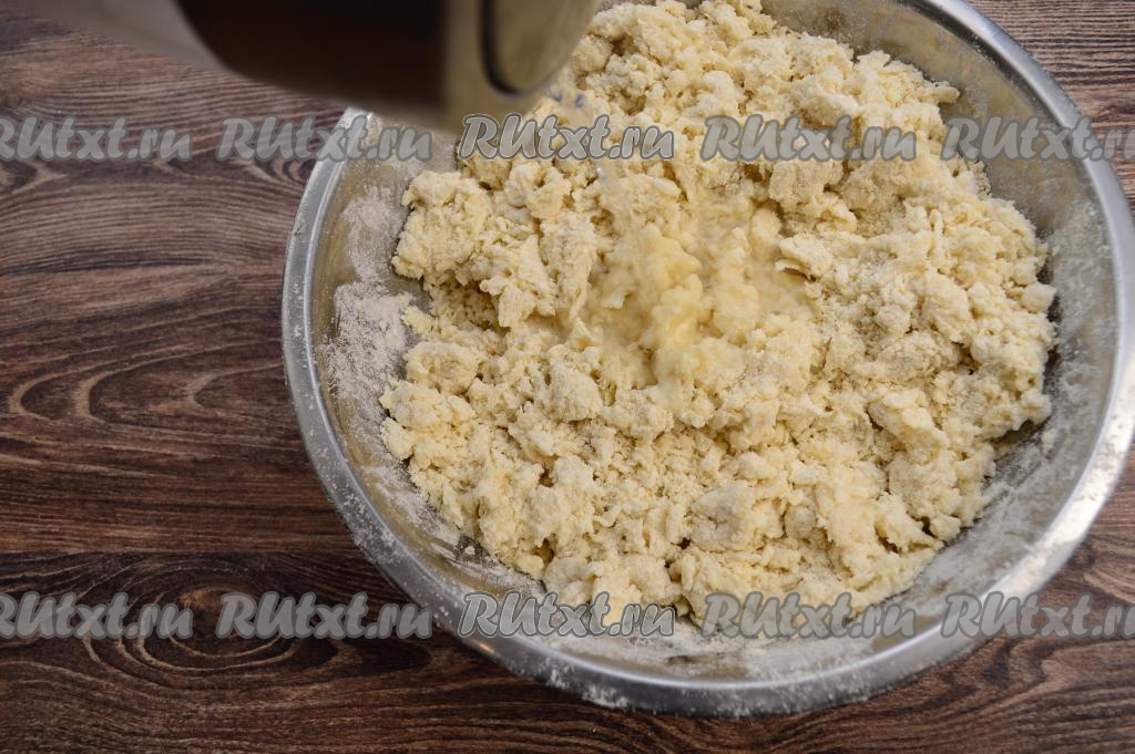 Затем влить ещё немного горячей воды, перемешать столовой ложкой, тесто в процессе смешивания с кипятком немного остынет, начать замешивать его руками, полностью смешивая муку с водой. Таким образом, понемногу вливая горячую воду, перемешивания ложкой, а затем вымешивая руками, продолжить замешивать тесто. Сначала тесто будет напоминать крошку, но по мере добавления понемногу горячей воды и вмешивания её, оно станет уплотняться, собираться в ком.