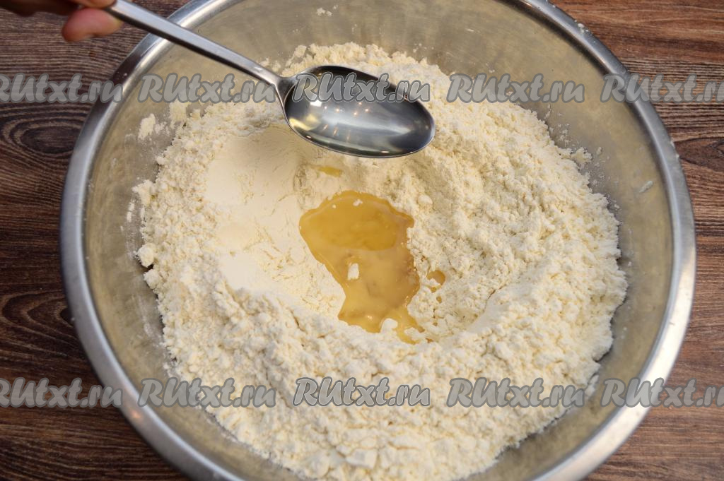 В центре смеси из муки и соли сделать небольшое углубление, влить в него растительное масло.