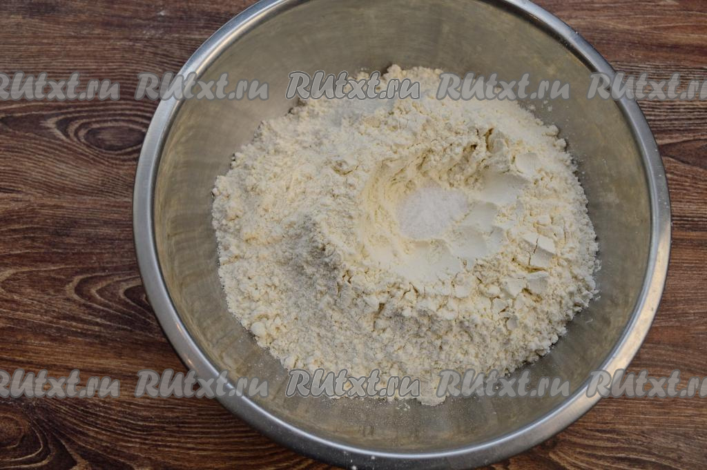 В глубокую миску высыпать отмеренную муку и соль, перемешать сухие ингредиенты.