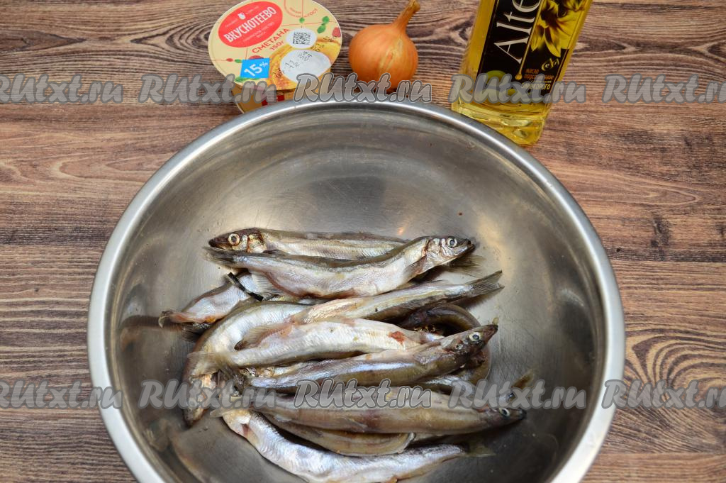 Подготовить продукты. Мойву, если она заморожена, полностью разморозить. Сметану можно взять любой жирности (я купила жирностью 15%).