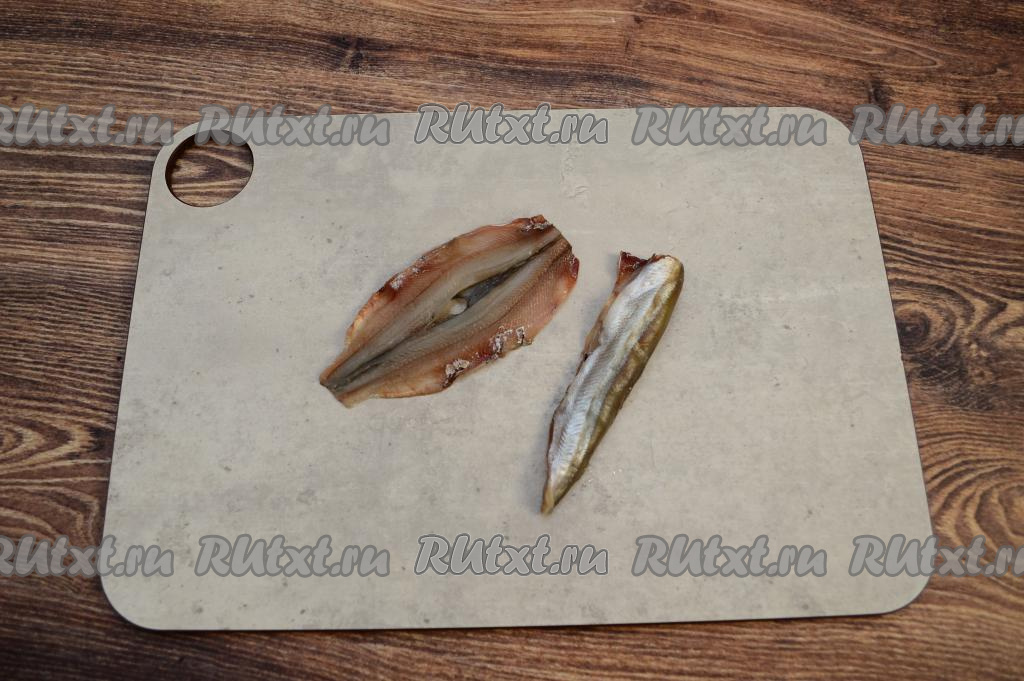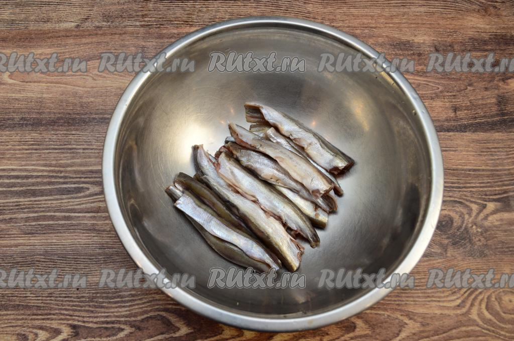 Отрезать голову, хвост и плавники у мойвы (я отрезаю кухонными ножницами), вынуть внутренности вместе с чёрной плёночкой из брюшка и основную хребтовую кость.