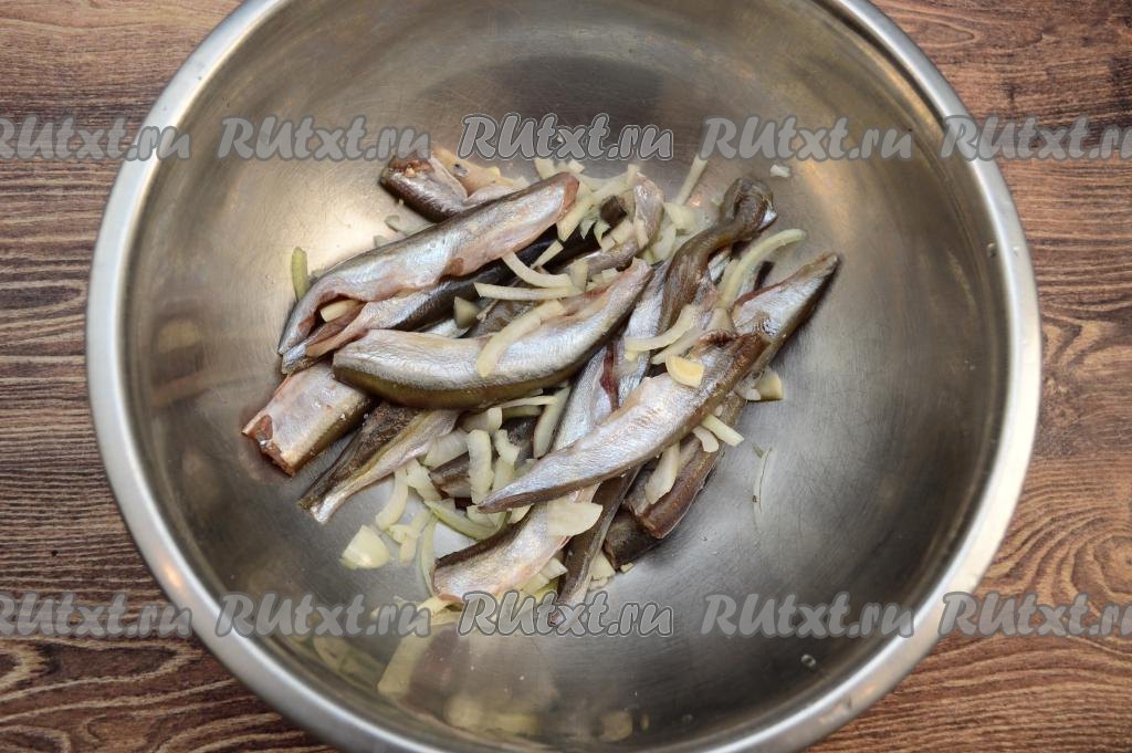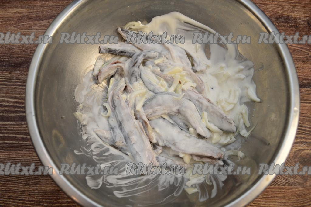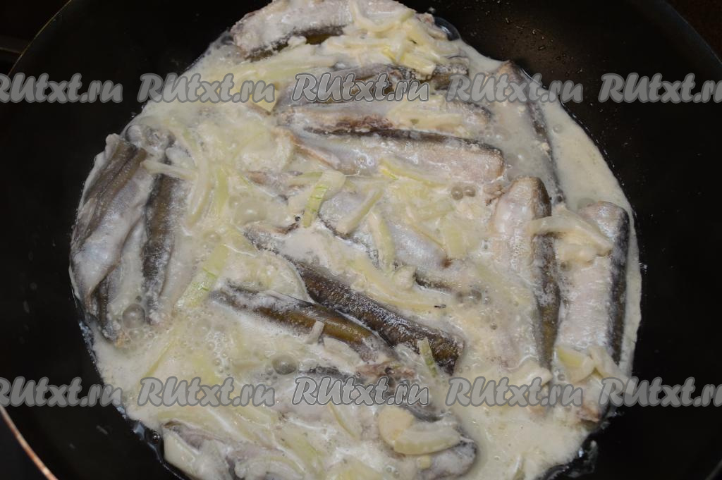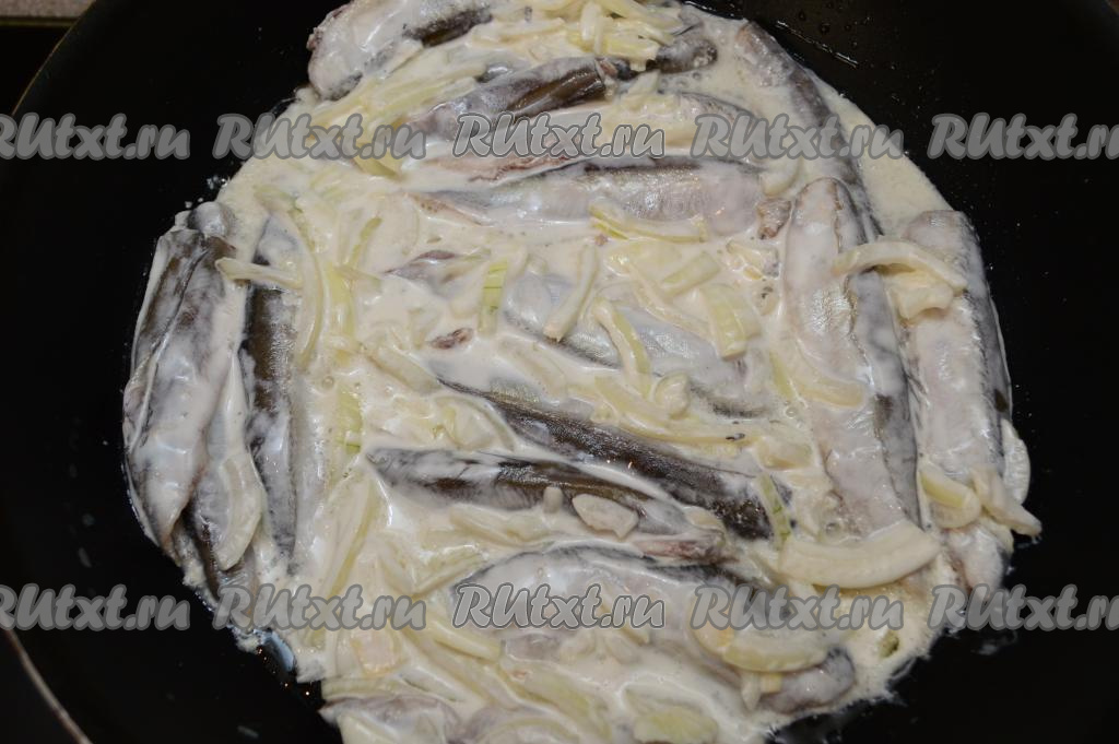 Затем добавить к мойве и луку сметану, перемешать.