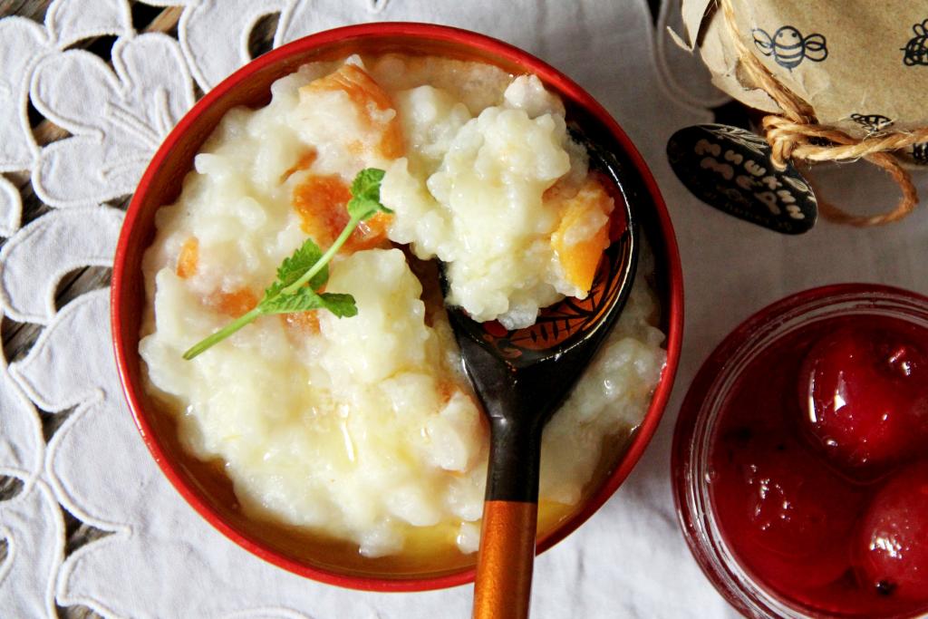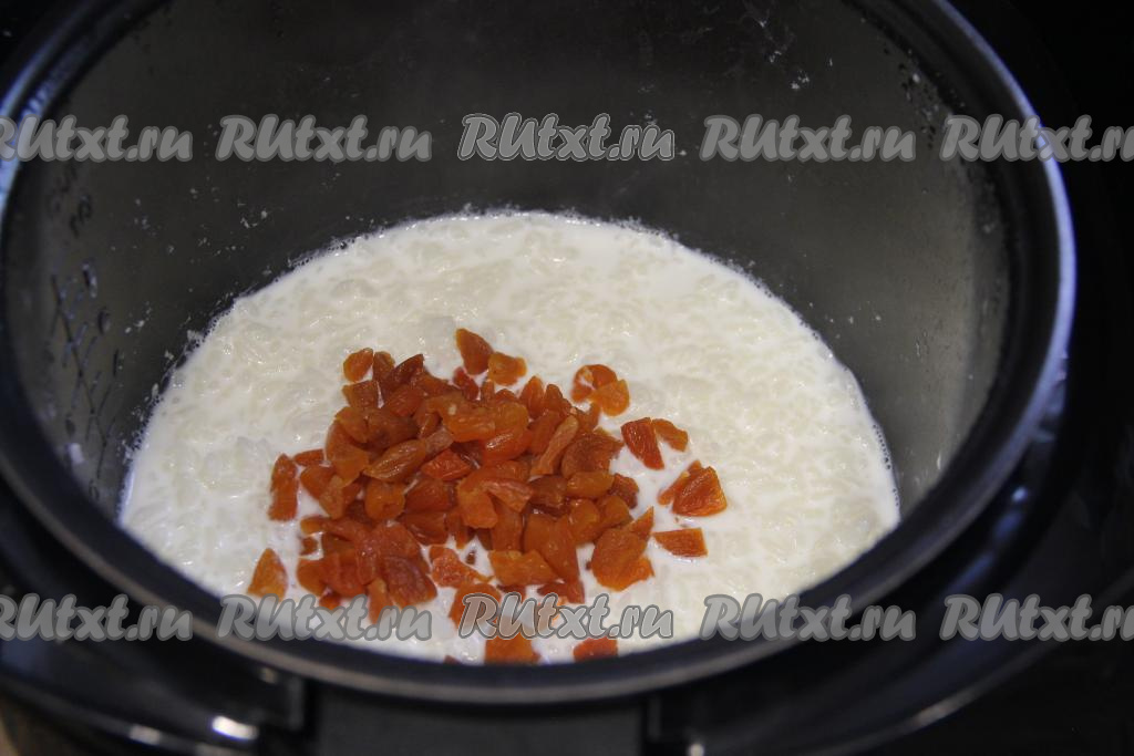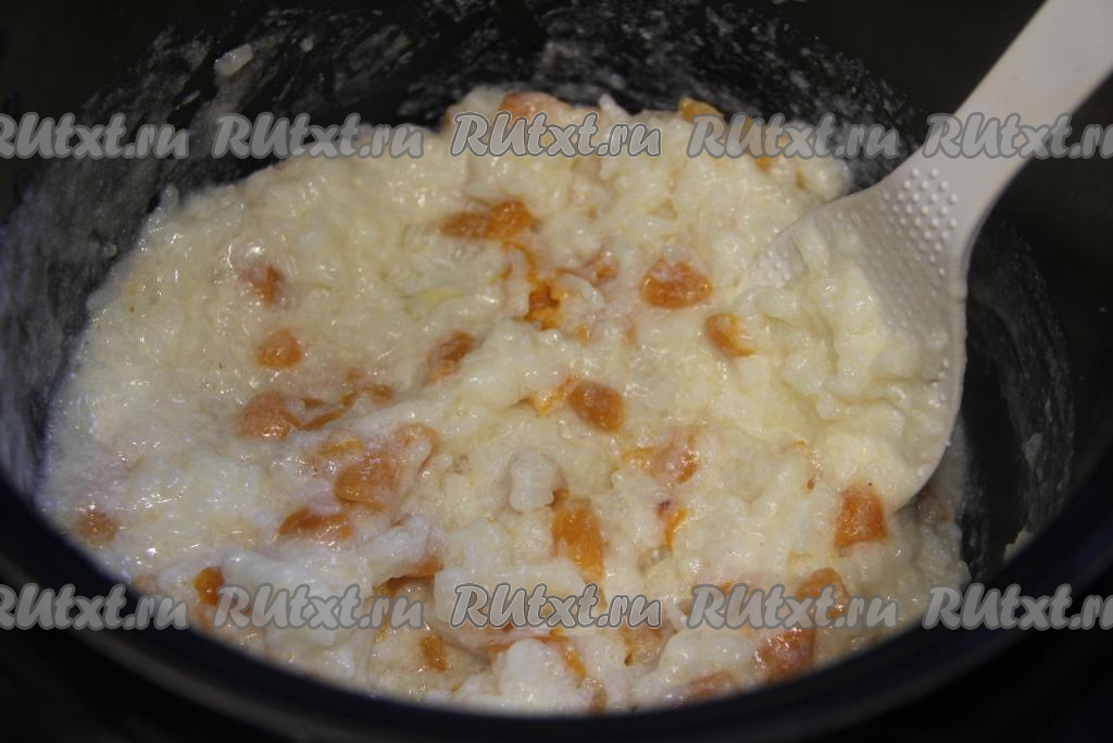 Курагу обдать кипятком, мелко нарезать. После звукового сигнала мультиварки добавить в рисовую кашу нарезанную курагу, перемешать.