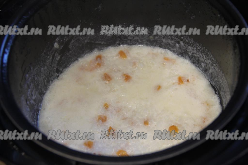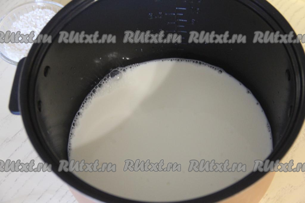 В чашу мультиварки влить воду и молоко, всыпать сахар и соль.