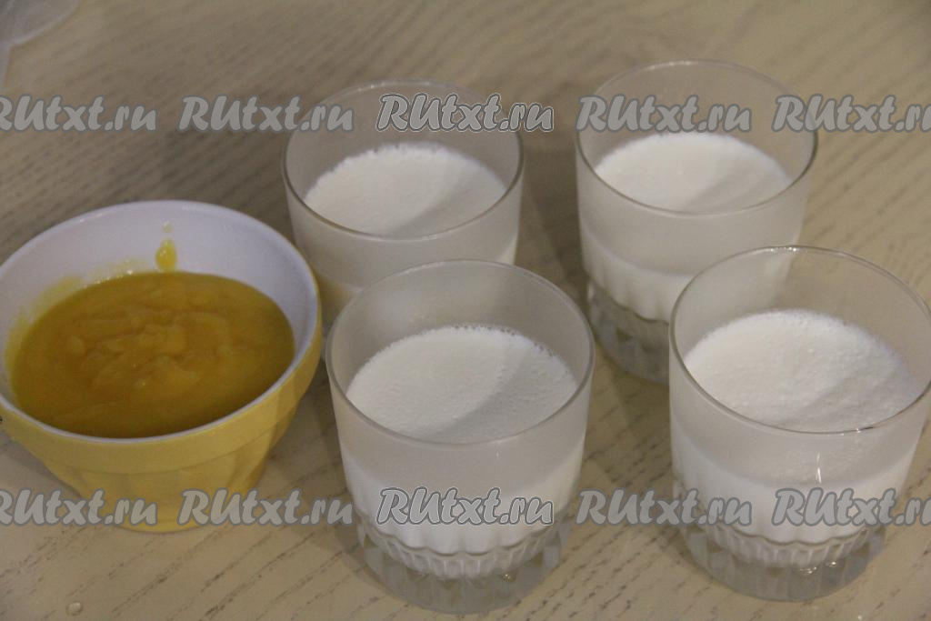 Для более удобного формирования десерта я перелила сливочно-желатиновую массу в мерный стакан с носиком. Разлить равномерно сливочно-желатиновую массу по фужерам или стаканам (я разлила по 4 стаканам). Поставить панна котту в холодильник минимум на 5-6 часов (до полного застывания).