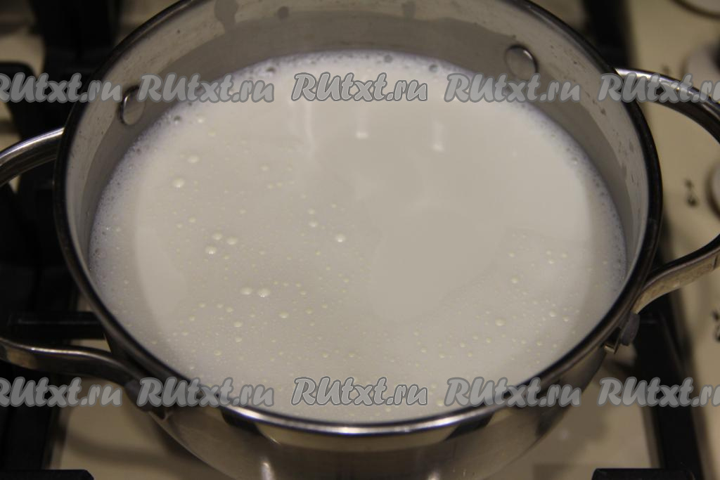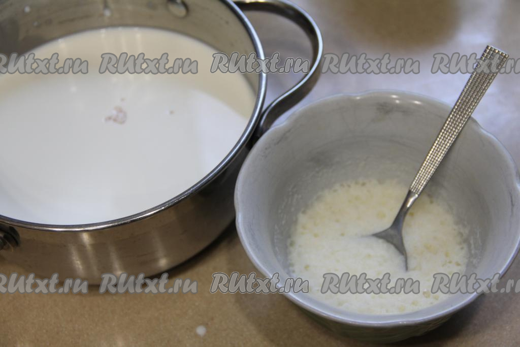Снять горячие сливки с огня и добавить в них набухший желатин. Перемешать массу венчиком до полного растворения желатина.