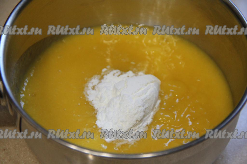 Измельчить манго в пюре с помощью измельчителя (или погружного блендера). Переложить манговое пюре в небольшую кастрюльку, добавить крахмал.