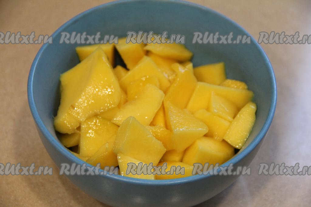 Манго очистить от кожуры, удалить косточку. 200 грамм очищенного манго нарезать на кусочки.