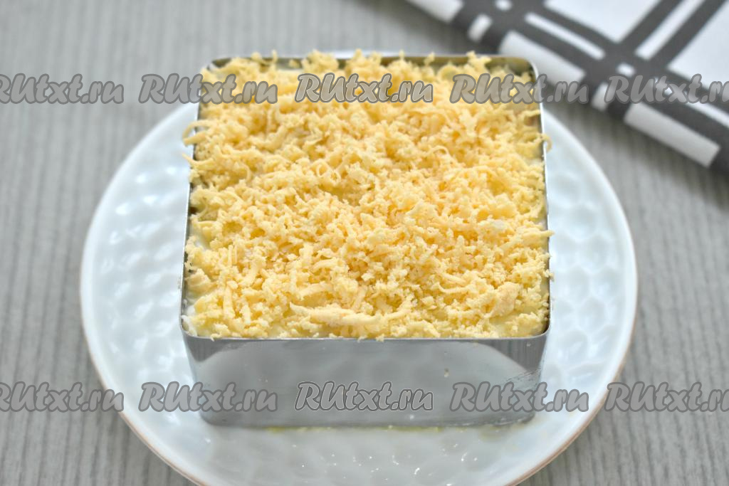Традиционно завершающим слоем салата "Мимоза" выладываем натёртые яичные желтки, майонезом этот слой смазывать не нужно.