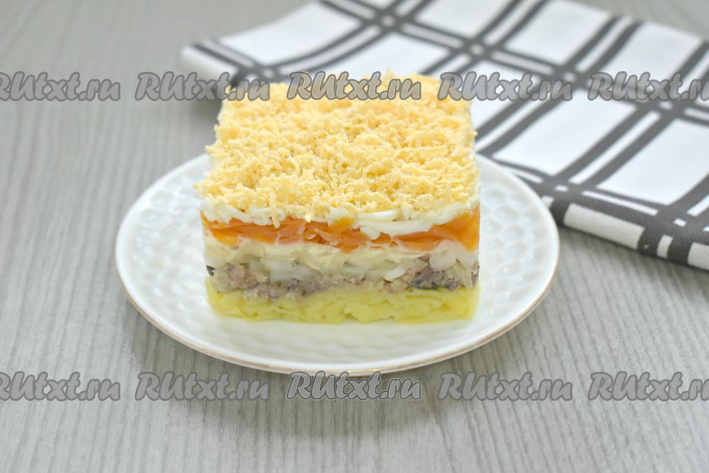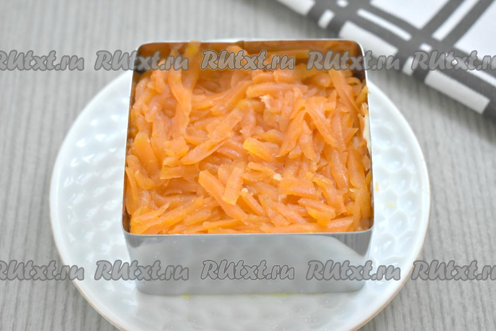 Следующим слоем выкладываем очищенную варёную морковь, натёртую на крупной тёрке. Слегка приминаем морковь в формочках столовой ложкой.