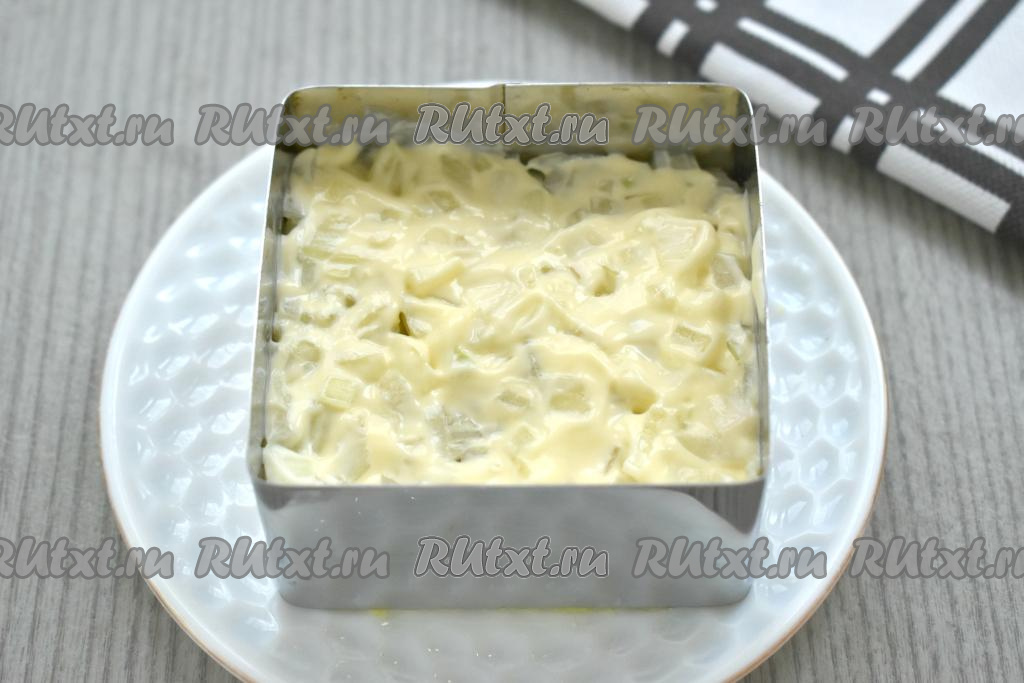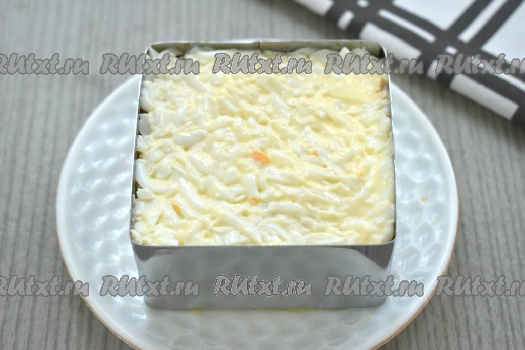 Даём салату пропитаться минут 30 в холодильнике, а затем аккуратно убираем формочки и можно подавать "Мимозу" к столу.