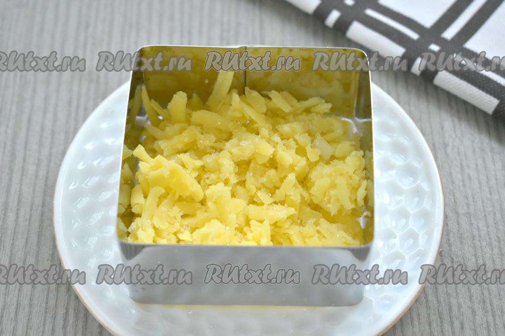 Салат "Мимоза" можно формировать в одном салатнике. Но я решила формировать его порционно, для этого взяла 2 сервировочные формочки диаметром 9 сантиметров, поставила на достаточно плоскую тарелку и приступила к формированию салата, равномерно раскладывая ингредиенты по 2 формам. Картофель очищаем, натираем на крупной тёрке, раскладываем по 2 формочкам, немного присаливаем и утрамбовываем ложкой.