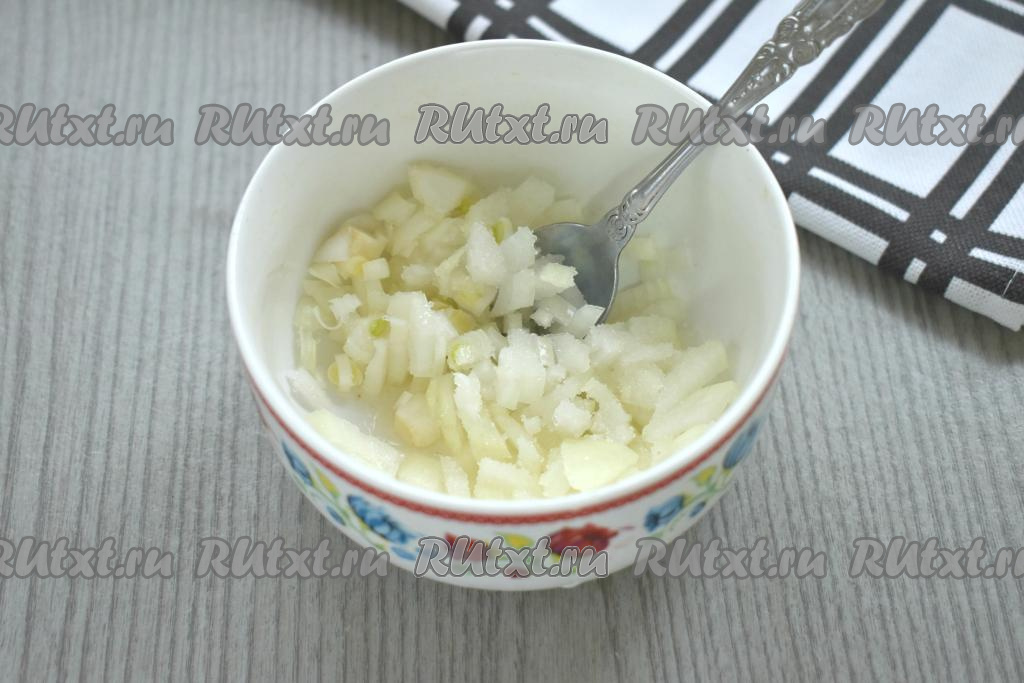 Очищаем лук, нарезаем на маленькие кусочки, выкладываем в небольшую миску, вливаем уксус, добавляем сахар, перемешиваем. Оставляем лук мариноваться на 10 минут.