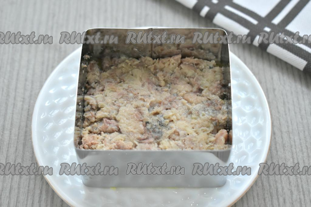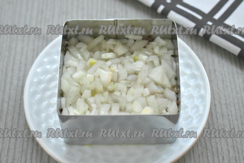 Замаринованный лук откидываем на сито, лишней жидкости даём стечь. На слой из рыбы по двум формочкам равномерно распределяем замаринованный лук.