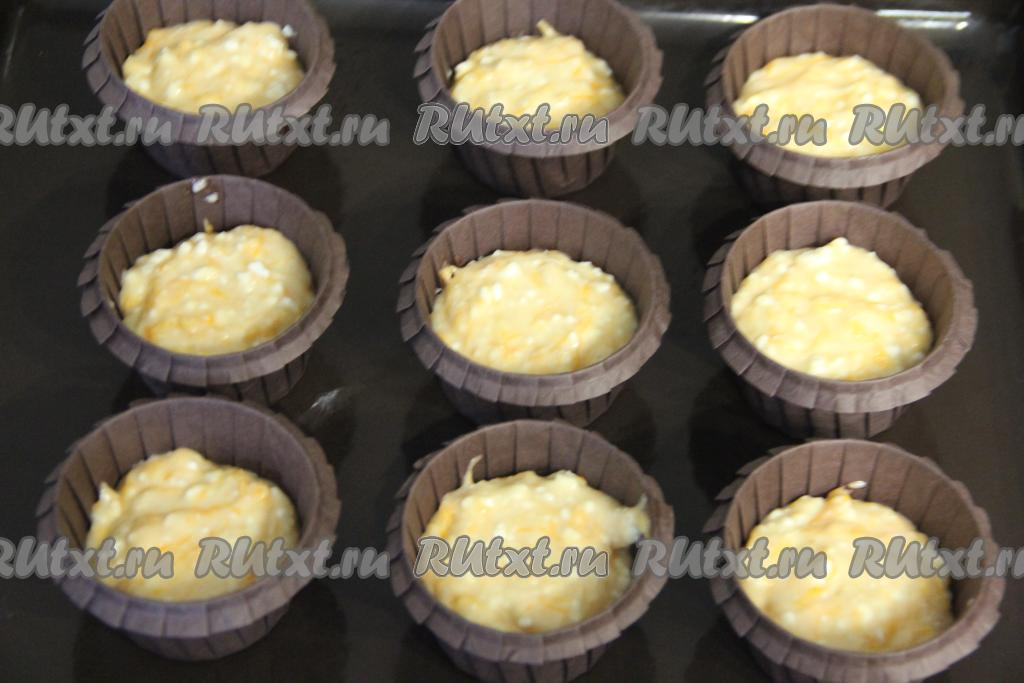 Разложить тесто по формочкам, заполняя их на половину объёма. Я раскладывала тесто по 9 одноразовым бумажным формочкам для кексов, можно выпекать и в силиконовых формочках. Формочки с тестом поставить на противень и отправить в духовку, разогретую до 180 градусов.