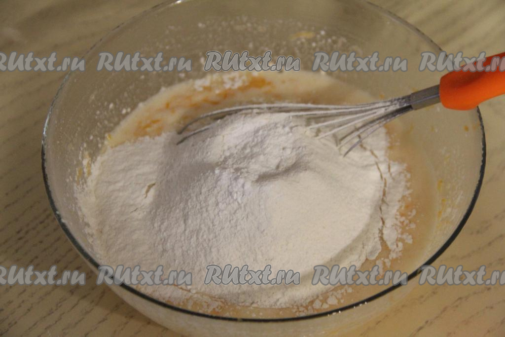 Всыпать 60 грамм просеянной муки, соль и разрыхлитель.