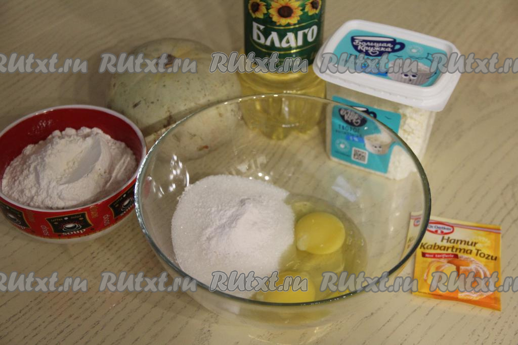 С помощью венчика перемешать яйца с сахаром в течение 3-4 минут (смесь должна немного посветлеть и слегка увеличиться в объёме). В получившуюся смесь добавить растительное масло, творог, перемешать яично-творожную смесь венчиком до однородности.
