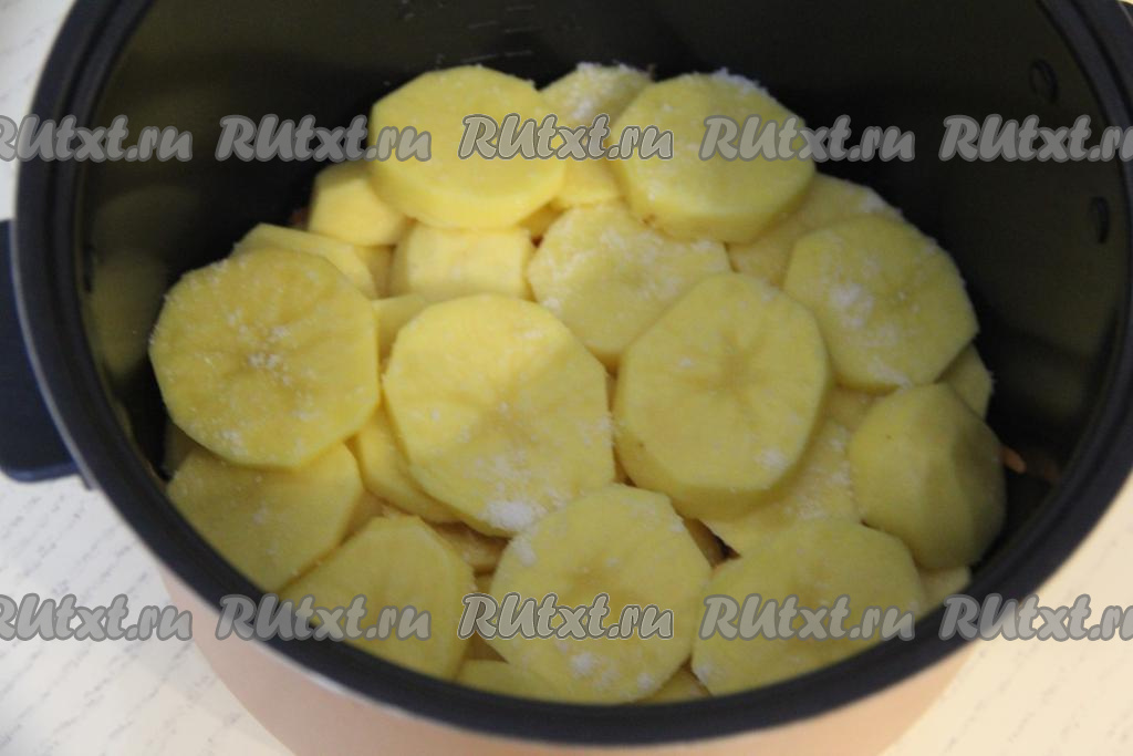 Картошку нарезать на кружочки толщиной примерно 5 миллиметров, выложить в чашу мультиварки, слегка посолить.