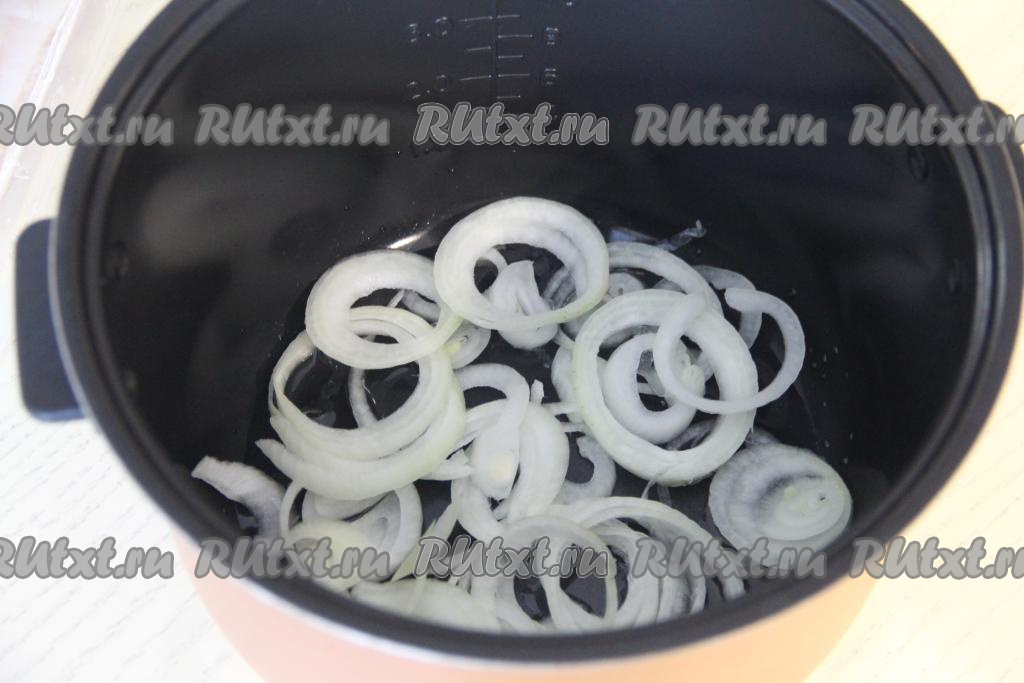 В чашу мультиварки влить растительное масло. Лук нарезать на кольца и выложить в чашу.