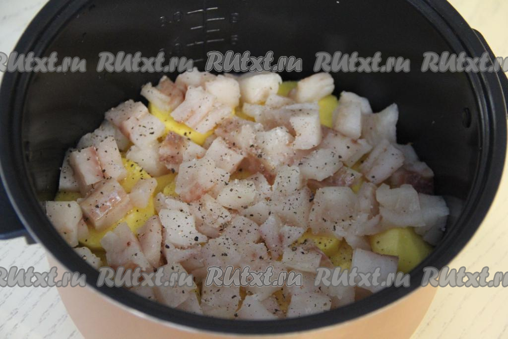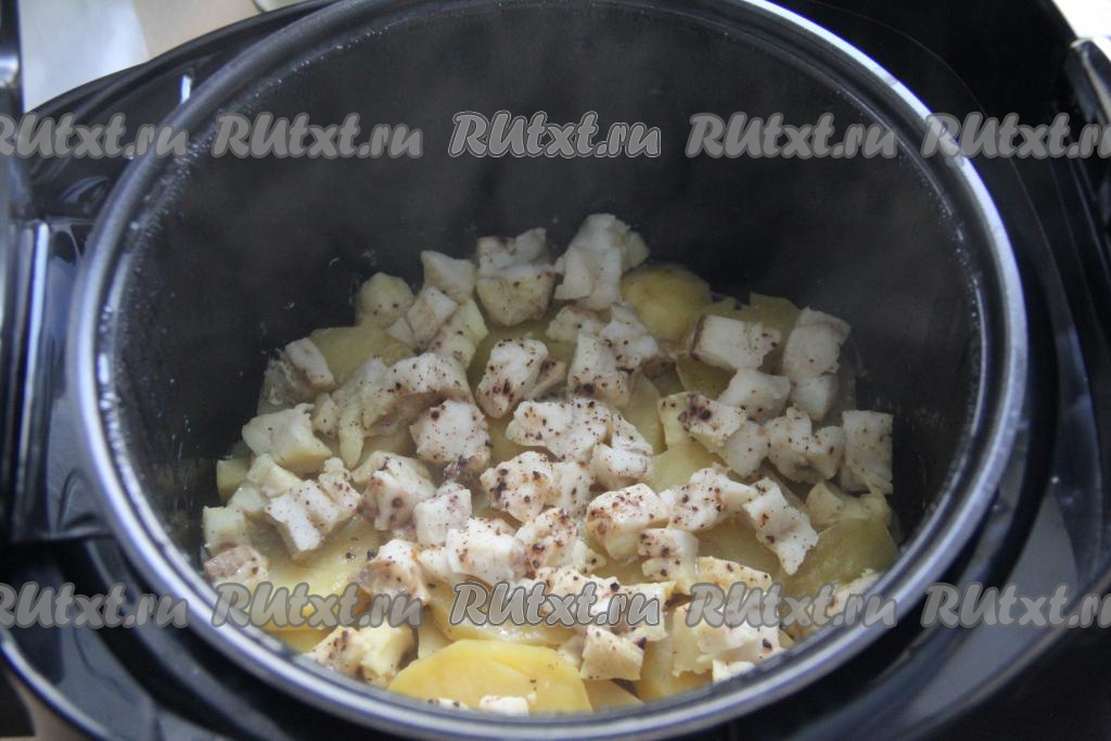 Филе минтая нарезать на кубики размером 2 сантиметра на 2 сантиметра. Выложить кусочки минтая поверх картошки, посолить и добавить немного специй для рыбы. Влить 100 миллилитров воды в чашу.