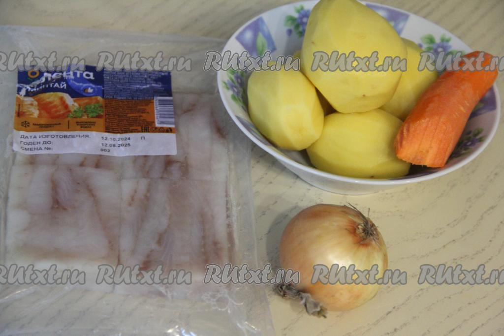 Подготовить продукты. Филе минтая разморозить при комнатной температуре. Картошку, лук и морковь почистить.