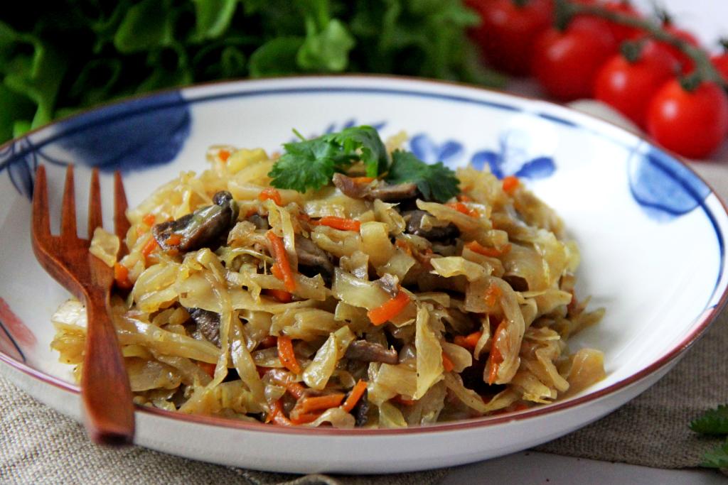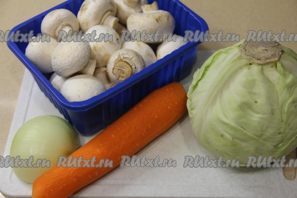 Капусту нарезать на тонкие полоски, выложить к шампиньонам с овощами.
