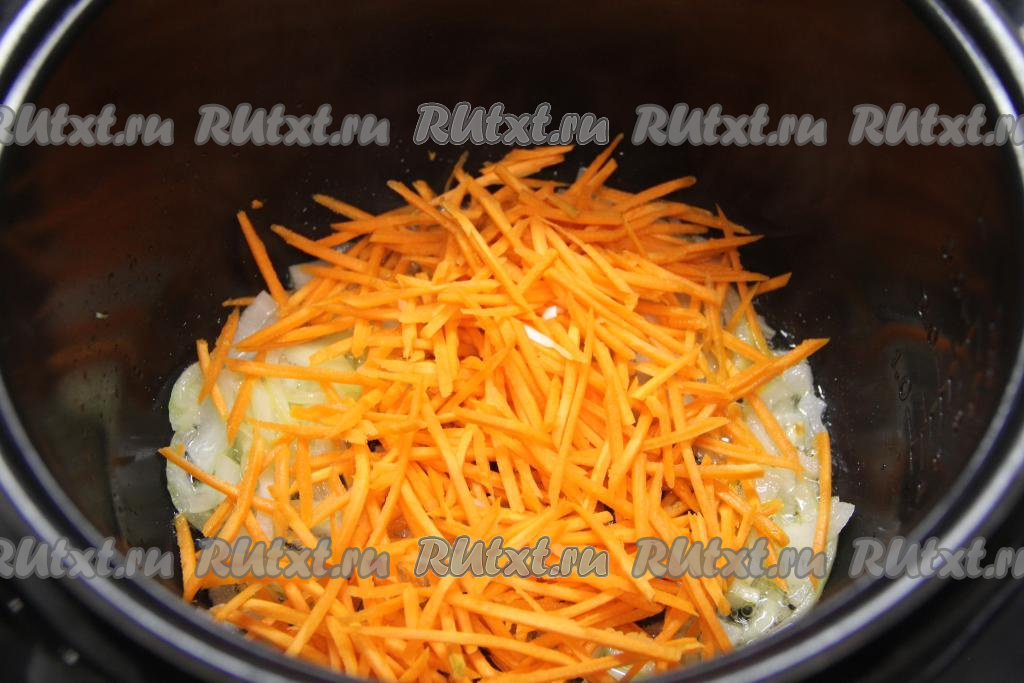 В чашу с обжаренным луком добавить морковку, натёртую на крупной тёрке, перемешать, обжаривать, периодически перемешивая, 5 минут.